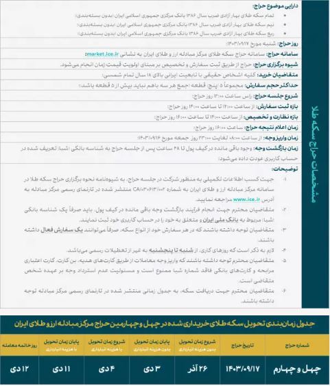 گفتنی است، متقاضیان شرکت در حراج‌های سکه طلای سامانه معاملات مرکز مبادله ایران، می‌توانند طی ۷ روز هفته و ۲۴ ساعت شبانه روز، از طریق سامانه معاملات این مرکز به آدرس اینترنتی market.ice.ir، اقدام به ثبت نام و احراز هویت کنند.